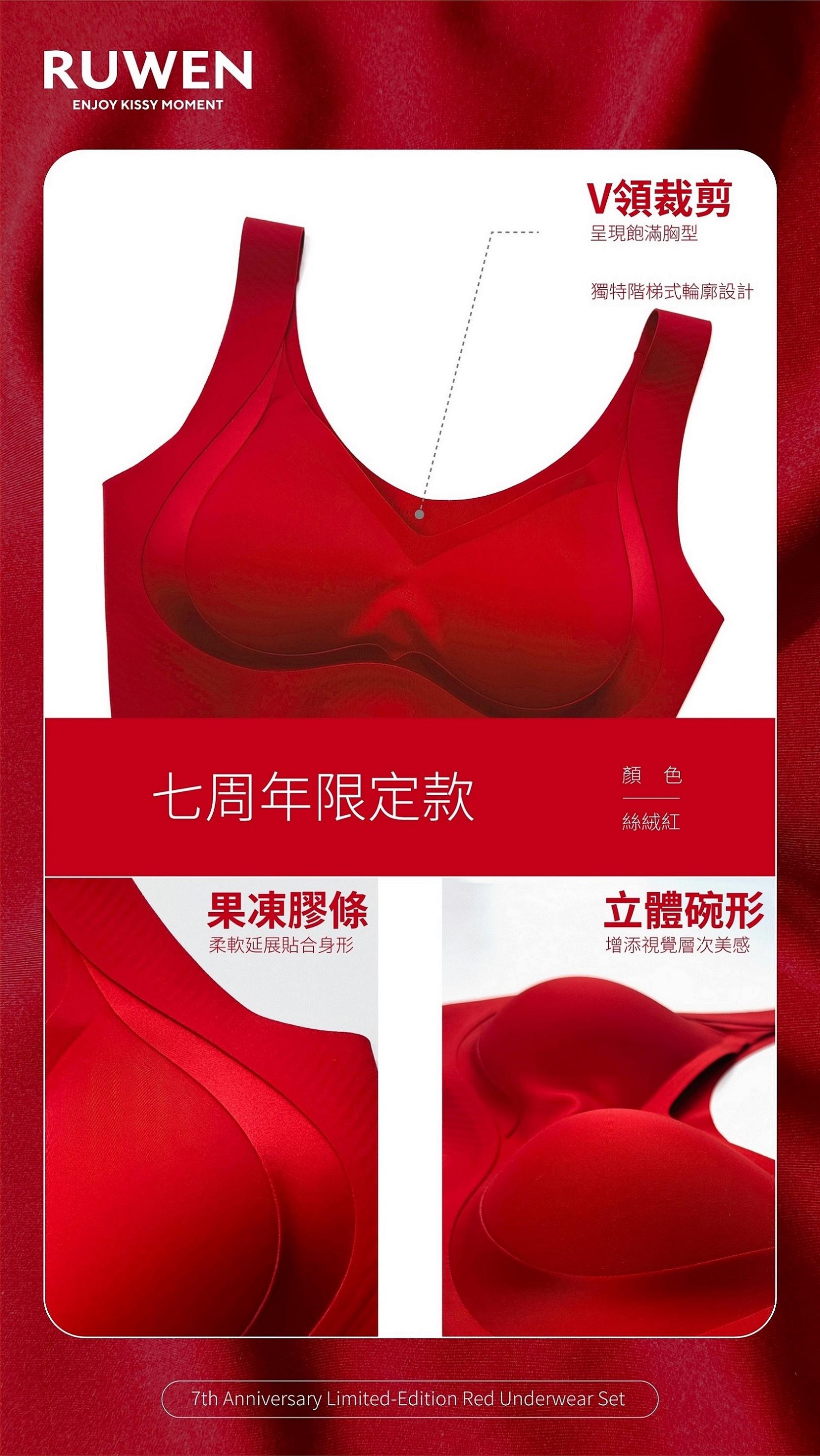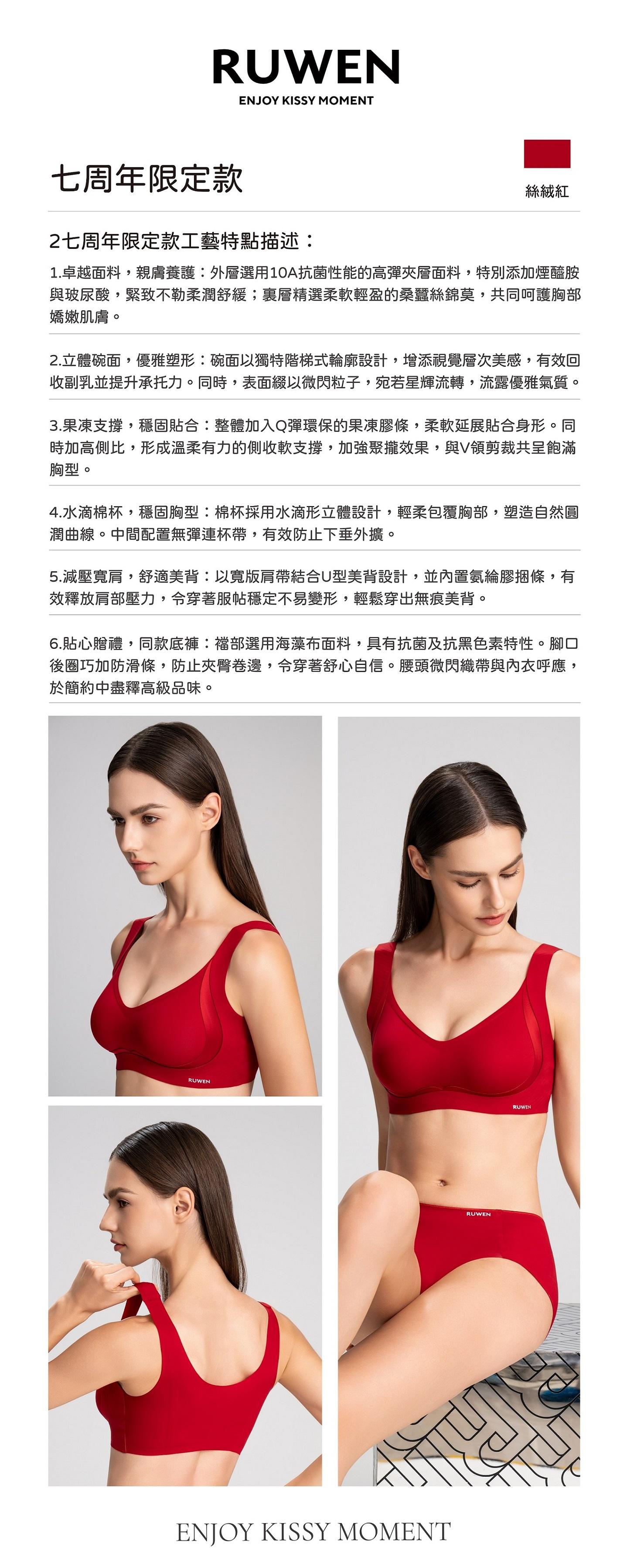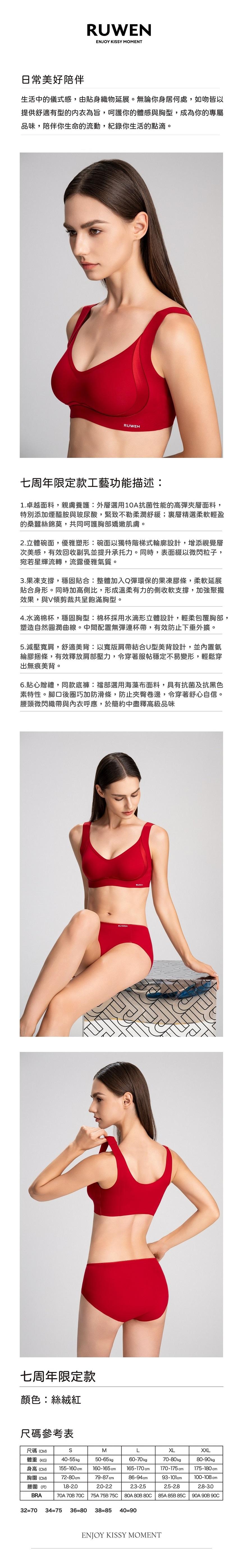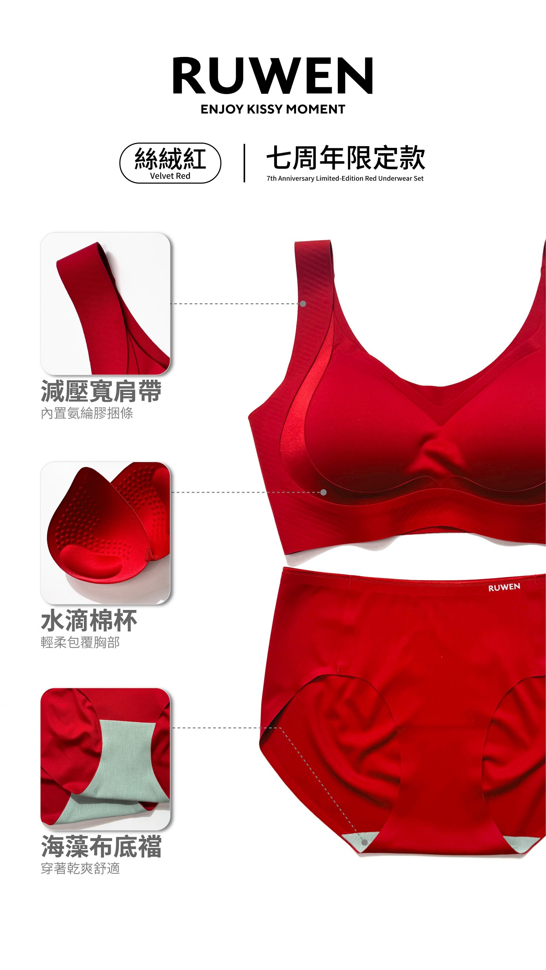 顏色:絲絨紅 尺寸:S.M.L.XL.XXL 樣式:立體碗面、減壓寬肩、U型美背設計 胸墊:水滴形立體設計,無彈連杯帶 內含:內衣一套【內衣+內褲】 本商品不提供網路訂購 欲購買此商品請與RUWEN經銷商聯繫