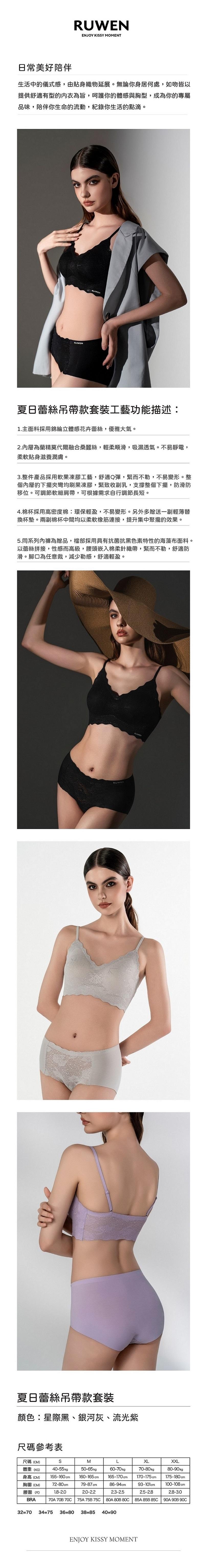 顏色:星際黑.銀河灰.流光紫 尺寸:S.M.L.XL.XXL 樣式:吊帶式.肩帶可調整 胸墊:連接式胸墊 內含:內衣一套【內衣+內褲+薄胸墊】 本商品不提供網路訂購 欲購買此商品請與RUWEN經銷商聯繫